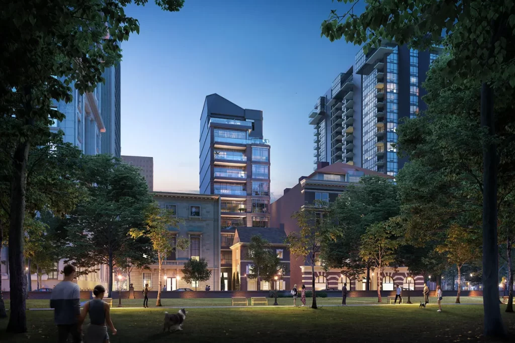 Boutique luxury condominium in Philadelphia featuring a 21-space PARKPLUS AGV automated parking system, integrated into a refined residential development overlooking a historic urban setting.