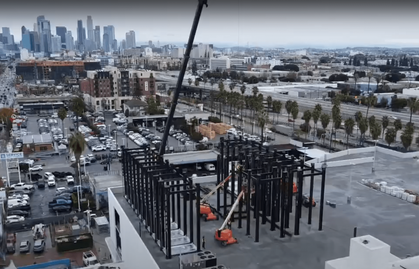 ParkPlus California is currently completing installation of quad stackers on the rooftop of Felix Chevrolet. The nature of this project is unique on its own as it will essentially change the skyline of downtown Los Angeles, but it also marks ParkPlus California’s 100th project. Quad Stackers are a mechanical parking system of four level lifts that store cars vertically. The stacker lifts vehicles on nested platforms between shared common legs, so that additional cars can be parked below.