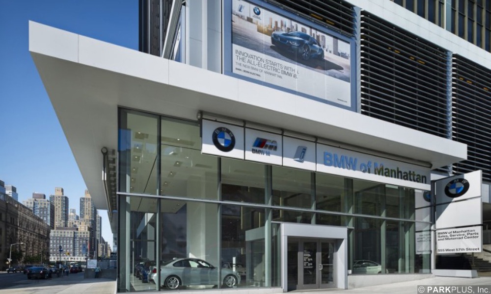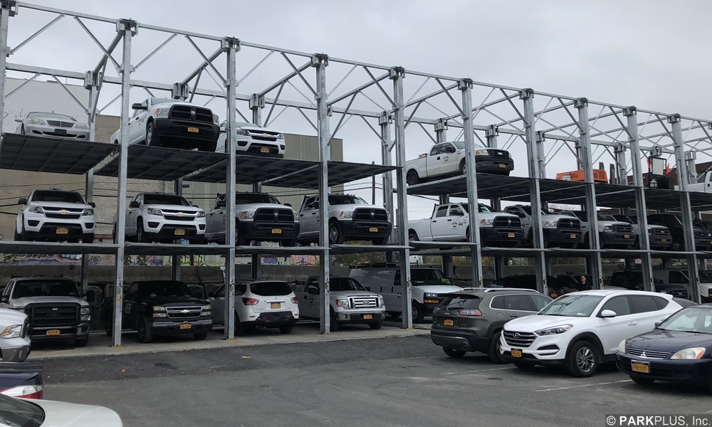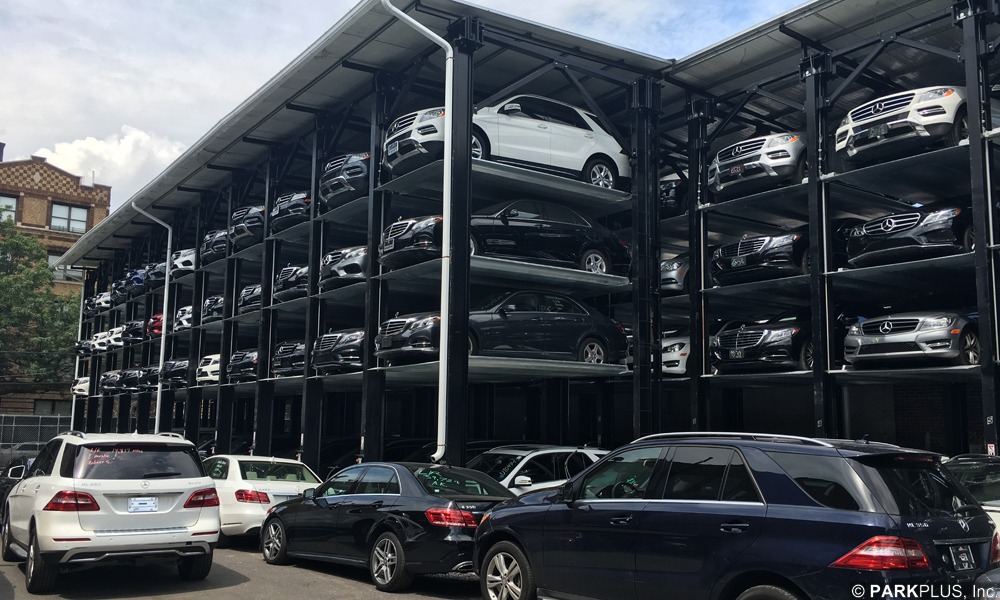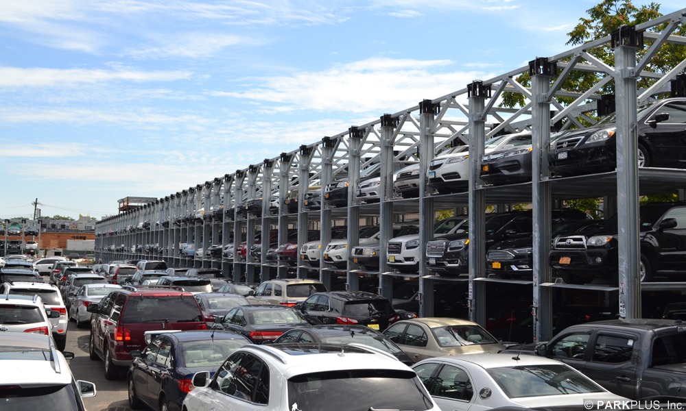 This auto dealership in Queens, New York is equipped with 34 Custom oversized ParkPlus QP1000 Quad Stackers with roof, gutters and leaders.