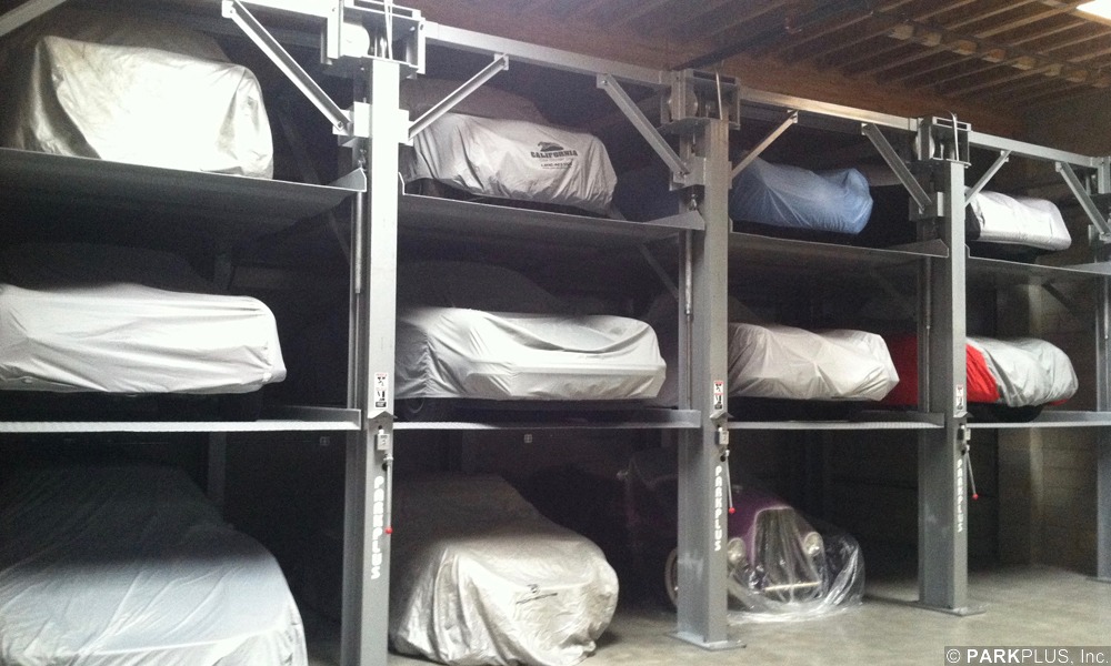 Canepa Design is a private collector's garage equipped with 4 ParkPlus QP1000 Quad Stackers and an outdoor modified QP1000 car hoist.