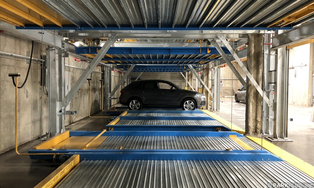 This office building in Hoboken is equipped with 55 ParkPlus DP003 Double Stackers in the basement parking garage. The stackers allowed the project to meet its parking count while avoiding excavating into the water table, saving the project millions of dollars.