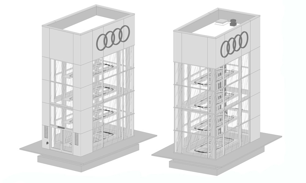 A Subaru Auto Dealership concept explored an 8-story ParkPlus Car Tower designed to store and showcase up to 29 vehicles. The tower would have created a prominent vertical display while increasing on-site vehicle capacity within a compact footprint.