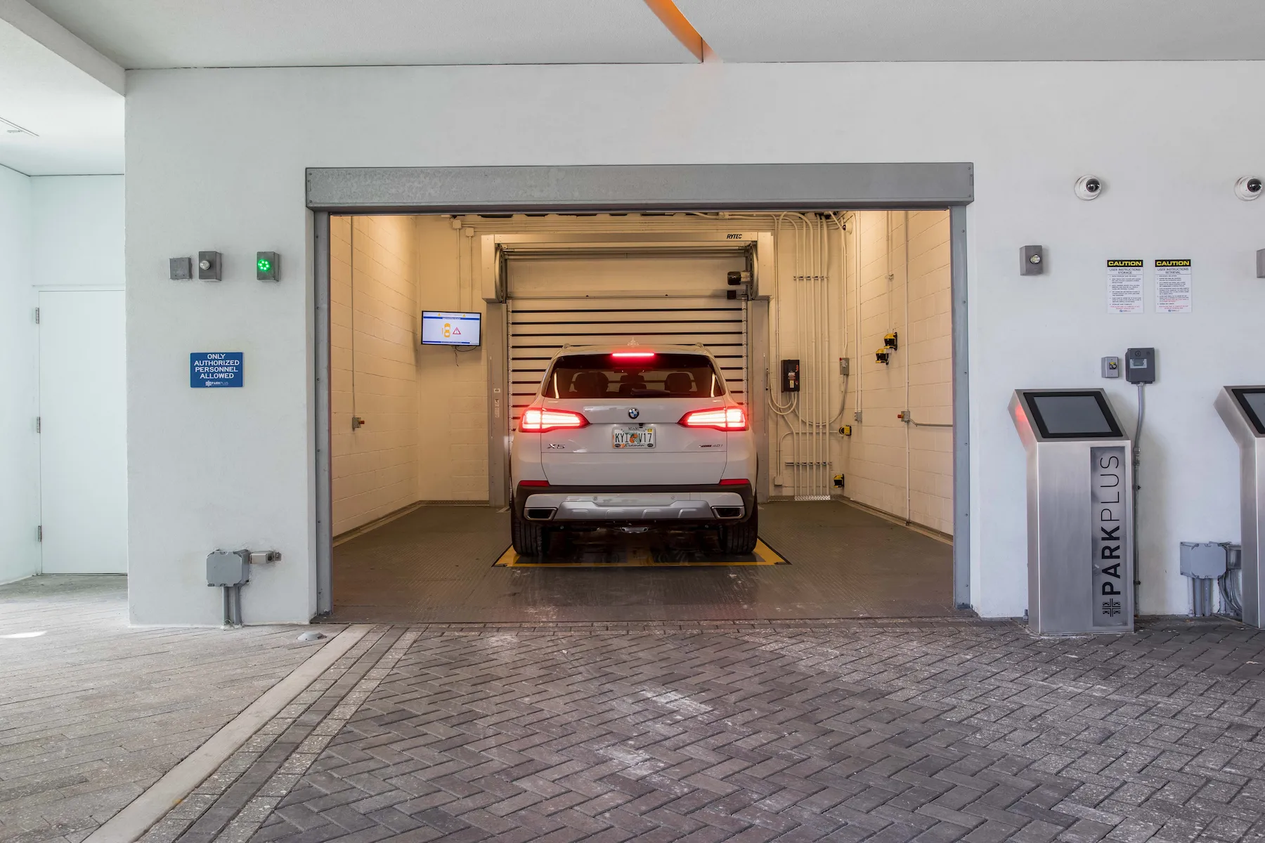 No driver ever enters the garage. The system operates without attendants and is monitored remotely by ParkPlus.