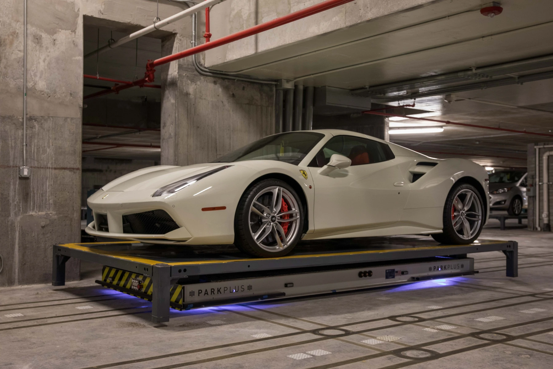 Eight autonomous robotic vehicles operate within the single-level subterranean garage, moving cars stored on flat trays. Residents pull to a street-level loading bay where laser sensors measure the vehicle’s dimensions in real time. An AGV then transports the car to an available space below. Retrieval is initiated through the ParkPlus mobile app, and the system brings the vehicle to the valet station on demand.