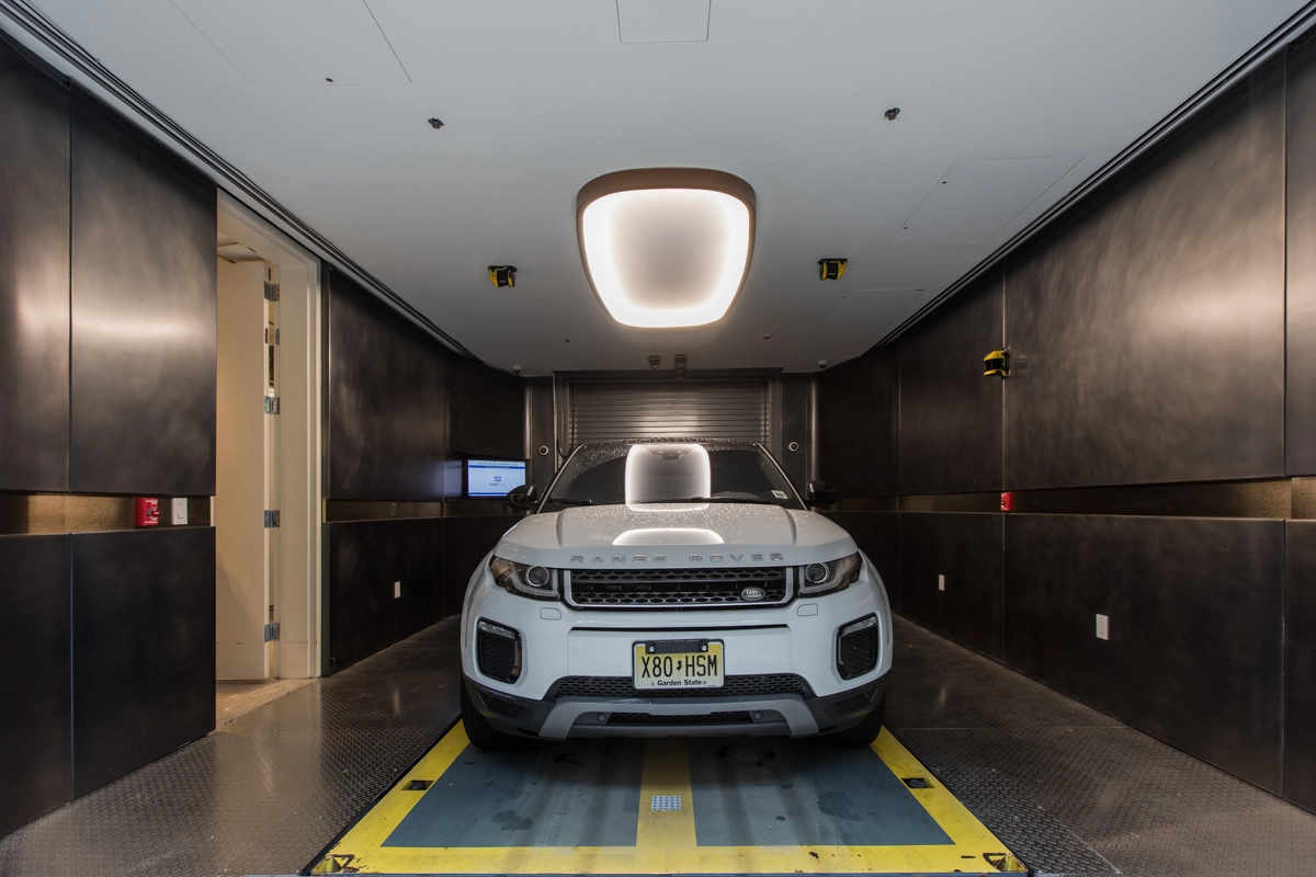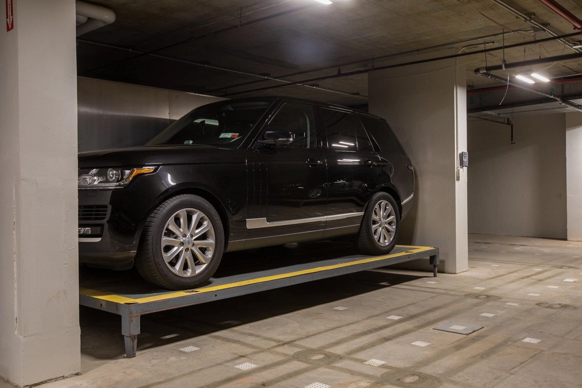 At 520 West 28th Street, the two-level subterranean installation accommodates 40 vehicles, served by a single entry point at street level.