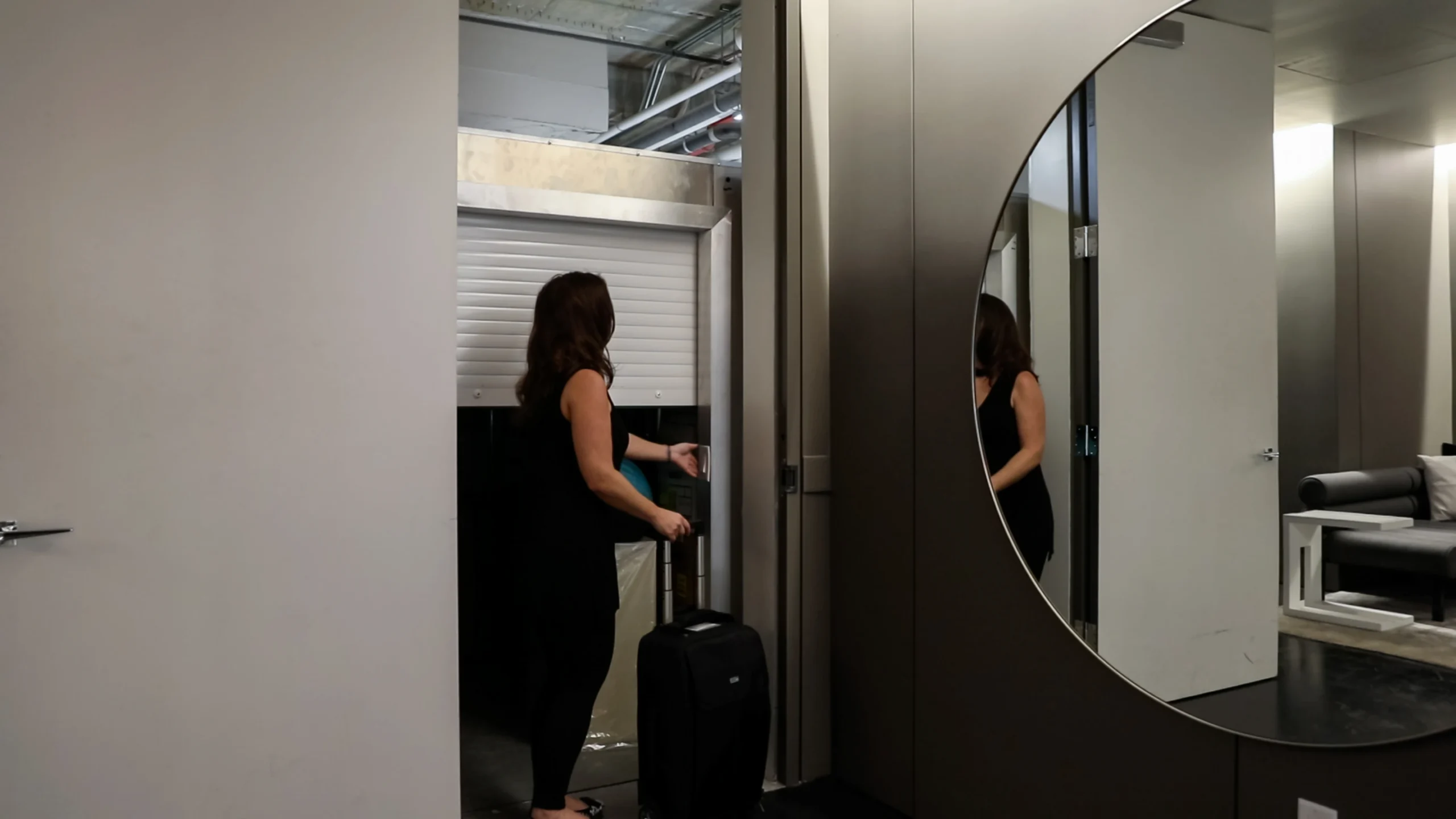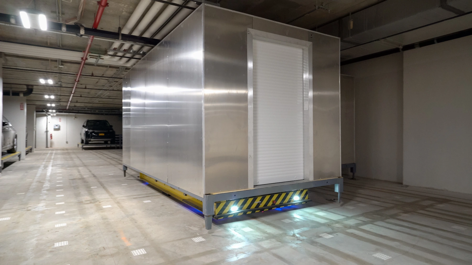 Adjacent to the parking structure sits a dedicated storage room — finished and appointed to match the building’s residential standard. Inside, twenty individual pods are managed by the same AGV robotics that move the cars. A resident presses a button. The system locates their pod, retrieves it, and delivers it to the room. A door opens. They step in, access their belongings privately, and leave. The pod returns to storage automatically.