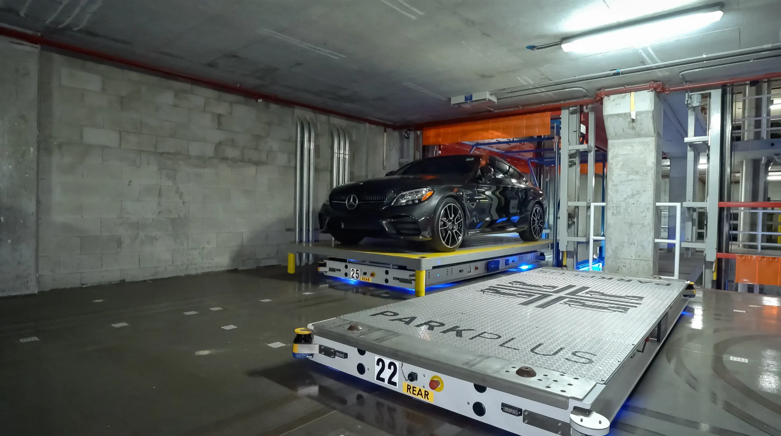 All movement is coordinated by the ParkPlus Maestro traffic management platform, using vision systems, embedded floor markers, and lasers to manage storage, retrieval, and all robot sequencing across 411 spaces simultaneously.